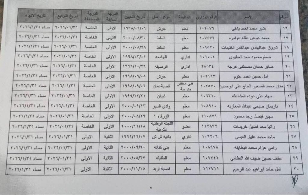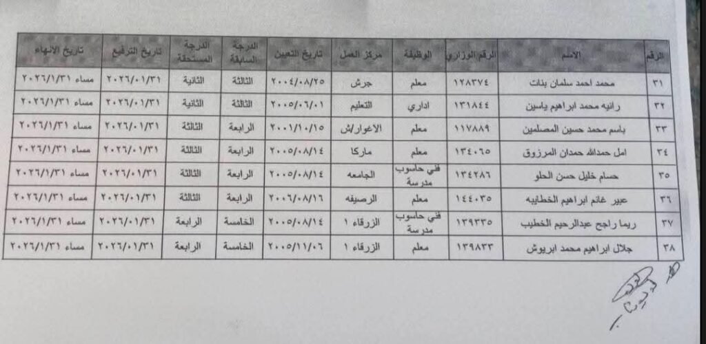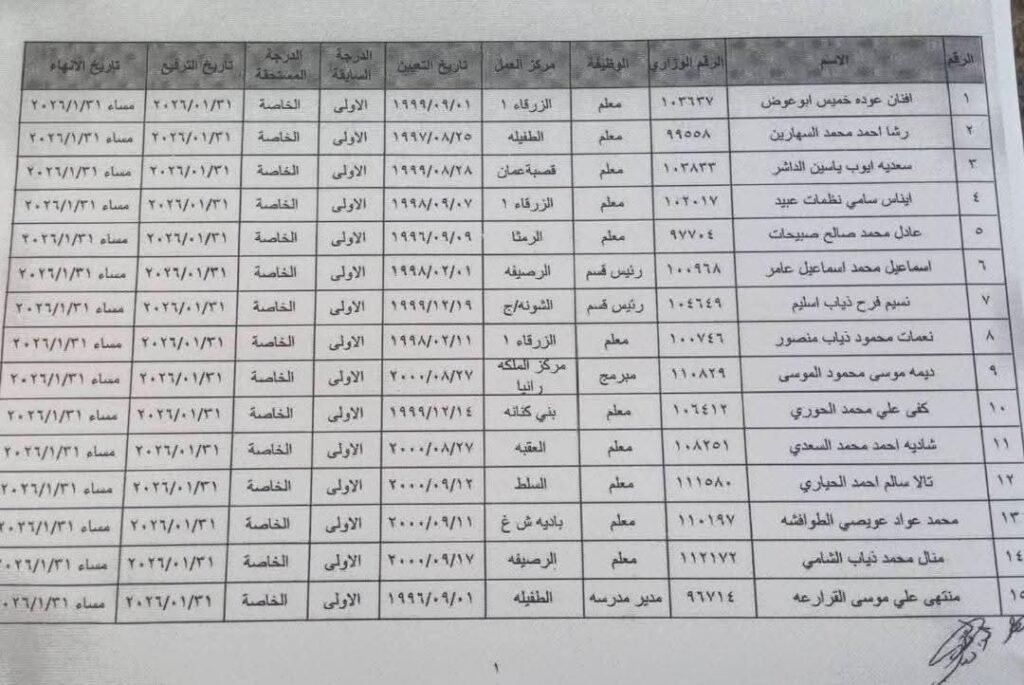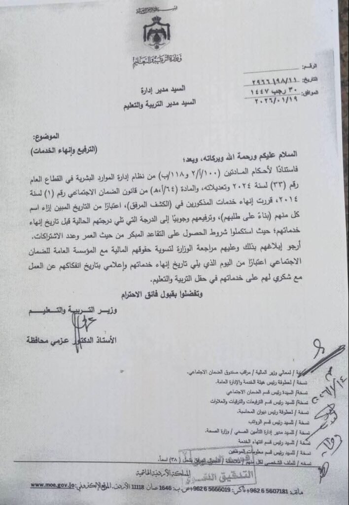 تعليم وجامعاترئيسي ترفيعات واحالات واسعة على التقاعد في وزارة التربية والتعليم.. اسماء Last updated: يناير 20, 2026 11:38 ص dawoud Share 0 Min Read SHARE وكالة تليسكوب الإخبارية You Might Also Like إغلاق مكتب أحوال وجوازات عمّان الغربية (جبل عمّان) القاضي يوجّه ردًا لنواب العمل الاسلامي : لا تمدحوا انفسكم كثيرا تسليم الدعم الملكي السنوي لـ 438 جمعية ومؤسسة ومركزا تعُنى برعاية أيتام ومسنين وذوي إعاقة جلالة الملك يغادر أرض الوطن في زيارة لجمهورية مصر العربية العمل تعلن عن 100 فرصة عمل جديدة للأردنيين Sign Up For Daily NewsletterBe keep up! Get the latest breaking news delivered straight to your inbox.[mc4wp_form]By signing up, you agree to our Terms of Use and acknowledge the data practices in our Privacy Policy. You may unsubscribe at any time. Share This Article Facebook Twitter Whatsapp Whatsapp Telegram Email Copy Link Print Share Previous Article تنقلات واسعة في وزارة الداخلية – أسماء Next Article البنك الأردني الكويتي يُعلن رابحي الجائزة السنوية الكبرى للعام 2025 والبالغة قيمتها 100 ألف دينار ضمن برنامج حساب التوفير – الجوائز