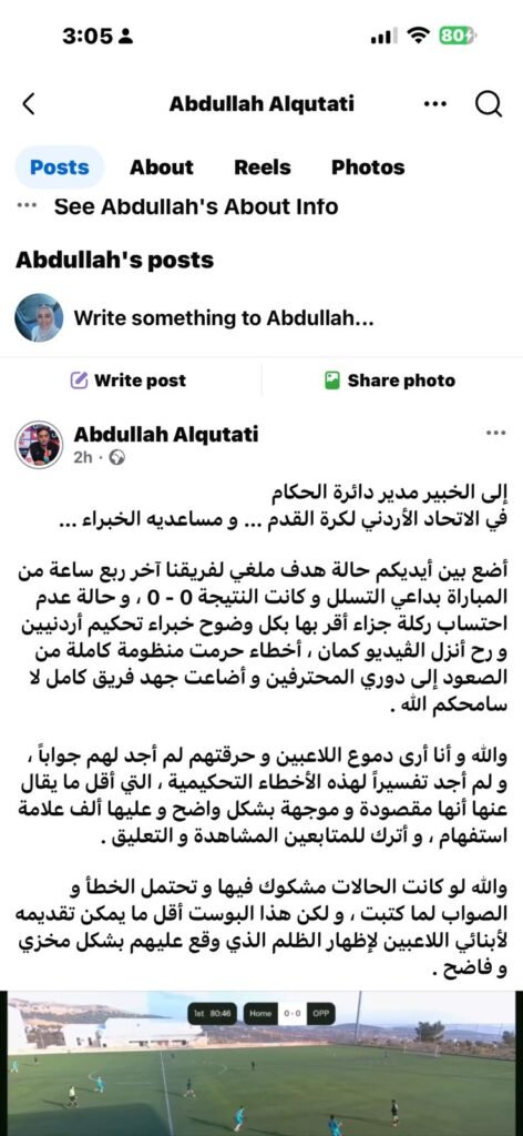 أضع بين أيديكم حالة هدف ملغي لفريقنا آخر ربع ساعة من المباراة بداعي التسلل و كانت النتيجة 0 – 0 ، و حالة عدم احتساب ركلة جزاء أقر بها بكل وضوح خبراء تحكيم أردنيين و رح أنزل الڤيديو كمان ، أخطاء حرمت منظومة كاملة من الصعود إلى دوري المحترفين و أضاعت جهد فريق كامل لا سامحكم الله .