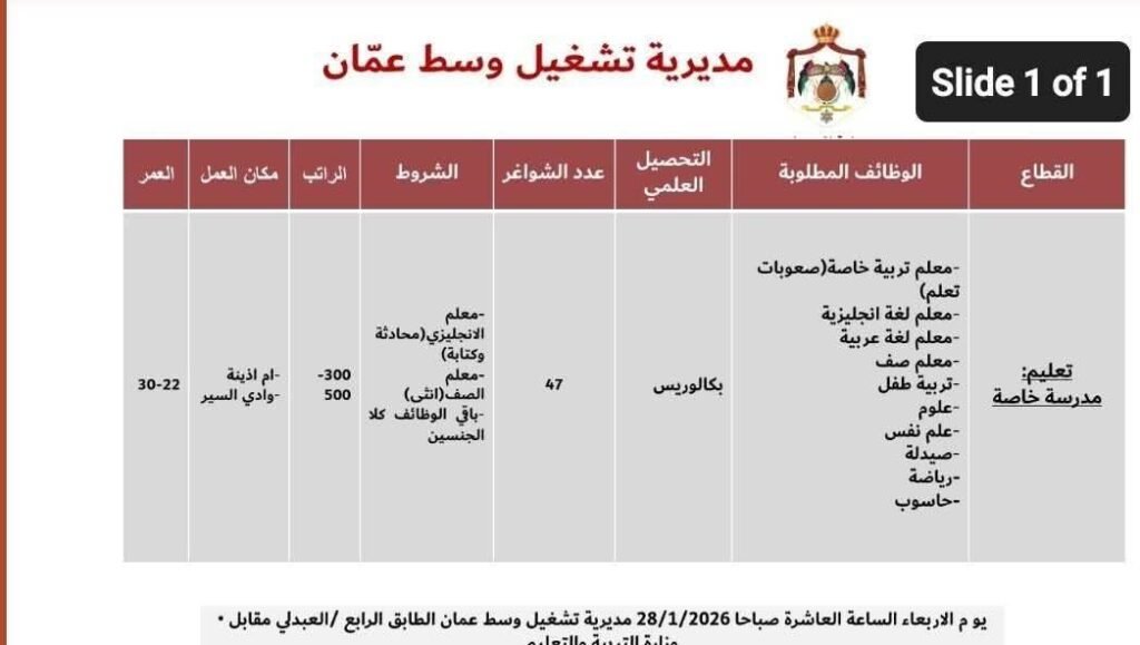 فرص عمل وظائف شاغرة للمعلمين والمعلمات براتب شهري 500 دينار .. التفاصيل Last updated: يناير 27, 2026 11:02 ص dawoud Share 0 Min Read SHARE وكالة تليسكوب الإخبارية مطلوب معلمين ومعلمات برواتب ٥٠٠ عدد ٤٧التقديم في مبنى المديرية You Might Also Like فرص تعليمية شاغرة للعمل في كبرى المدارس وظائف للاناث فقط مطلوب للعمل لدى لكبرى المدارس الدوليه في السعوديه – جده مطلوب للعمل لدى لكبرى المدارس الدوليه في السعوديه جده مطلوب للعمل لدى لكبرى المدارس الدوليه في السعوديه جده Sign Up For Daily NewsletterBe keep up! Get the latest breaking news delivered straight to your inbox.[mc4wp_form]By signing up, you agree to our Terms of Use and acknowledge the data practices in our Privacy Policy. You may unsubscribe at any time. Share This Article Facebook Twitter Whatsapp Whatsapp Telegram Email Copy Link Print Share Previous Article توقيف مندوب شركة تواطأ مع موظف في وزارة التربية والتعليم Next Article الغويري والطراونة يستقيلان من حزب “عزم”