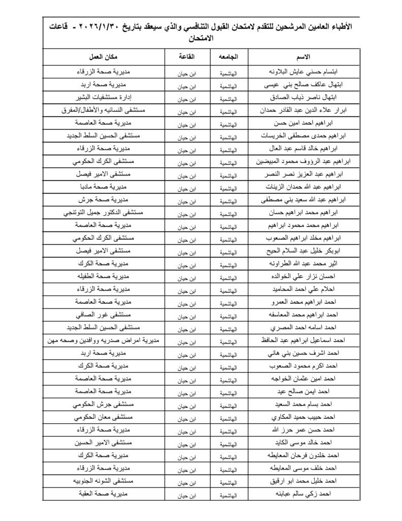 أعلنت وزارة الصحة الأردنية الإثنين اسماء الاطباء العامين المرشحين للتقدم لامتحان القبول لبرنامج الاقامة – المنوي عقده يوم الجمعة الموافق 30 / 1 /2026 – موزعين على قاعات الامتحان.