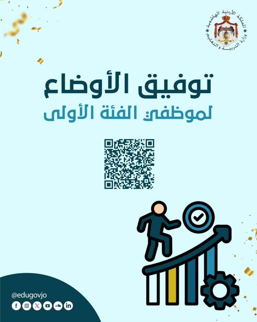 تقرر توفيق أوضاع الموظفين المذكورين في الرابط المرفق إلى راتب السنة والدرجة من الفئة الأولى، وذلك اعتبارًا من تاريخ 31/12/2025، وفقًا لمؤهلاتهم العلمية (الدبلوم العالي، الماجستير، أو الدكتوراه).