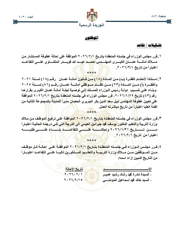قرر مجلس الوزراء ترفيع موظفين في عدد من الوزارات والدوائر والمؤسسات وإحالات إلى التقاعد.