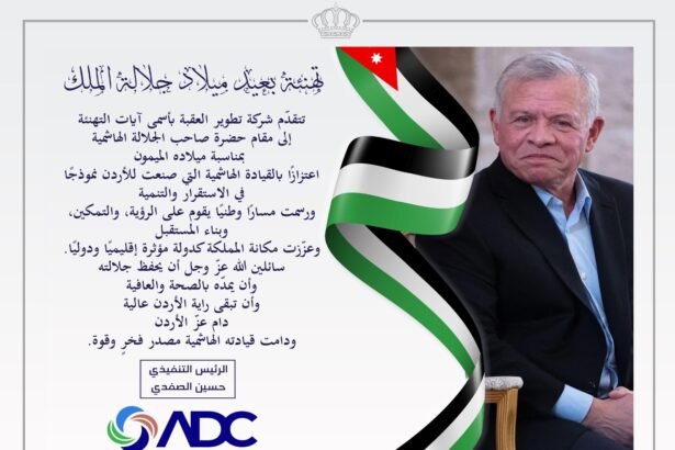 تتقدم شركة تطوير العقبة بأسمى آيات التهنئة إلى مقام حضرة صاحب الجلالة الهاشمية بمناسبة ميلاده الميمون