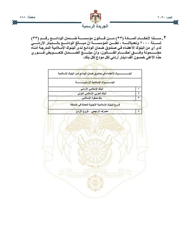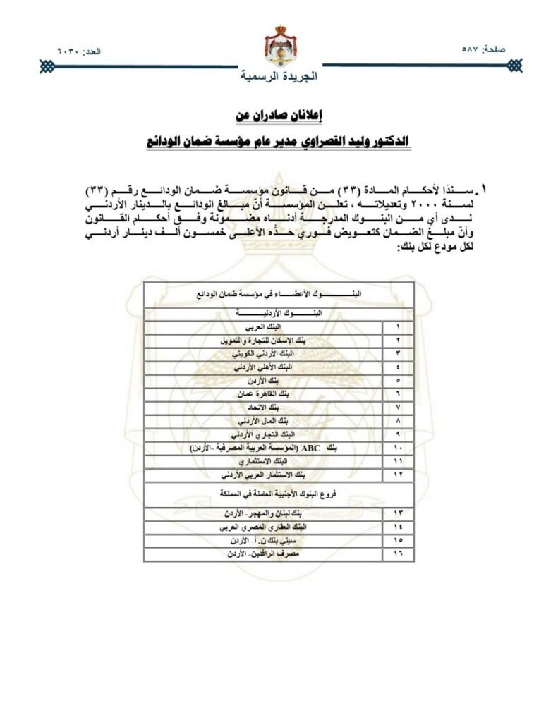 سندا لأحكام المادة (۳۳) من قانون مؤسسة ضمان الودائع رقم (۳۳) لسنة ۲۰۰۰ وتعديلاته، تعلن المؤسسة أنّ مبالغ الودائع بالدينار الأردني لدى أي من البنوك المدرجة أدناه مضمونة وفق أحكام القانون، وأن مبلغ الضمان كتعويض فوري حده الأعلى خمسون ألف دينار أردني لكل مودع لكل بنك: