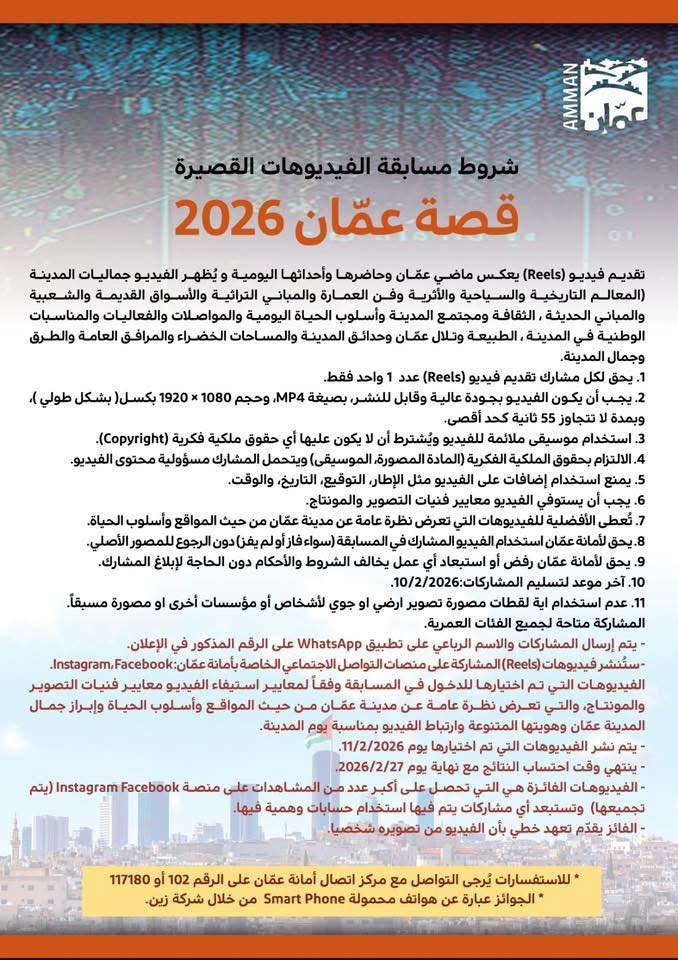 تُطلق أمانة عمان مسابقة فيديوهات قصيرة (Reels) تحت عنوان قصّة عمّان 2026 لتسليط الضوء على جمال المدينة وهويتها