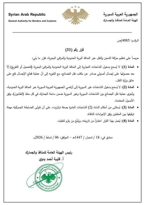 ملاحظة للمصدر: يأتي هذا القرار في إطار تنظيم الدور اللوجستي داخل المنافذ السورية، ومن المتوقع أن يؤثر على تكاليف وزمن عملية الشحن للبضائع المتوجهة للمقاصد السورية النهائية.