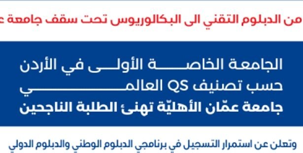 تعلن جامعة عمان الاهلية عن استمرار القبول والتسجيل بكلية التعليم التقني ببرنامجي الدبلوم الوطني والدبلوم الدولي للطلبة الناجحين بالثانوية العامة وحصلوا على معدل ما فوق 50 بالمائة ، للفصل الدراسي الثاني 2025-2026 ، في عدد من التخصصات المطلوبة في سوق العمل .