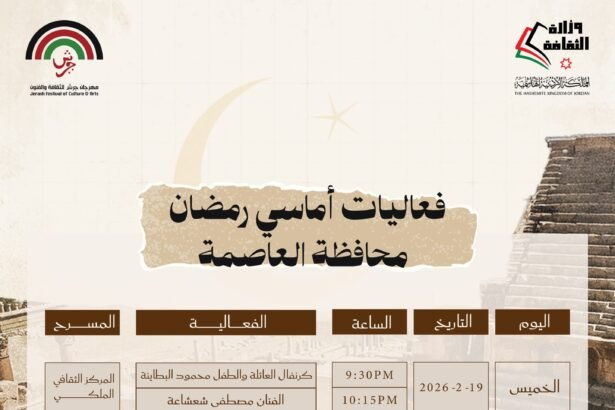 تحت شعار الفرح والروحانية.. “أماسي رمضان” تفتح أبوابها للأردنيين في كافة المحافظات ، تستعد مديريات الثقافة في كافة أنحاء المملكة الأردنية الهاشمية لاستقبال العائلات في “أماسي رمضان”، المبادرة النوعية التي تنظمها وزارة الثقافة بالتعاون مع إدارة مهرجان جرش للثقافة والفنون ، وتنطلق هذه الأمسيات لتكون وجهة العائلة الأولى خلال الشهر الفضيل، حيث تمزج بين عذوبة القصائد في الأمسيات الشعرية، وروحانية الإنشاد الديني، وصولاً إلى العروض الفنية المبدعة. وللأطفال نصيبٌ وافر، حيث يرافق الفعاليات كرنفال عائلي يملأ قلوب الصغار بهجةً ومرحاً.