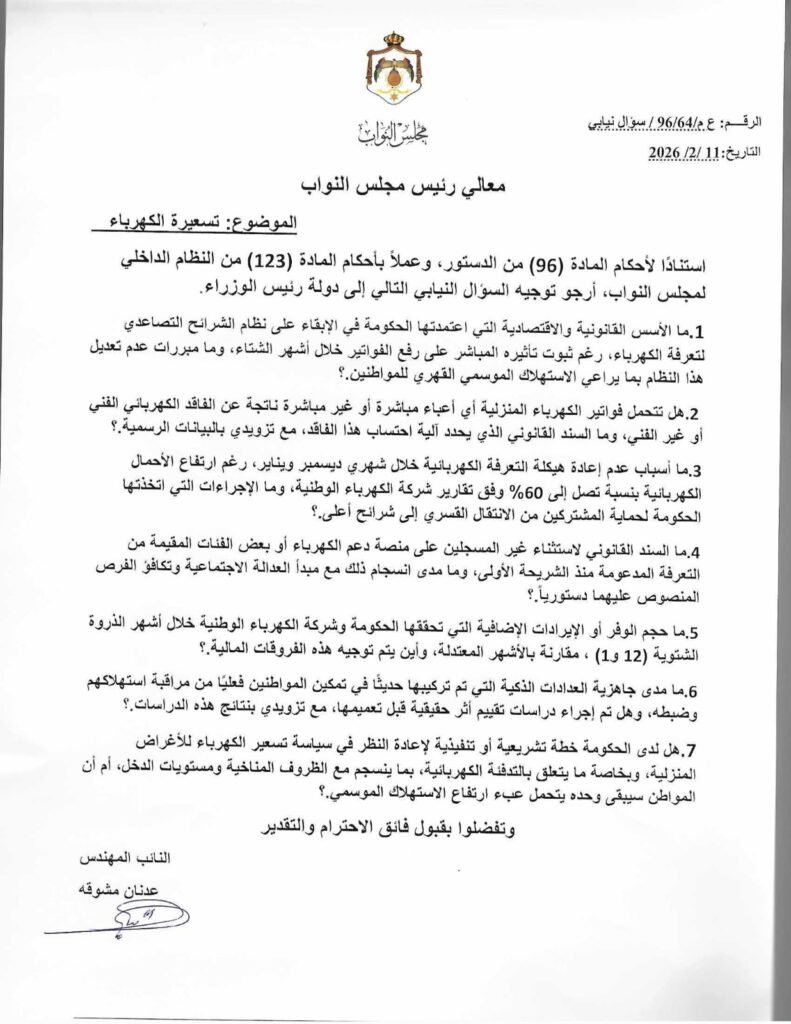 وجه النائب المهندس عدنان مشوقه سؤالا الى الحكومة حول فاتورة الكهرباء و الأسس القانونية والاقتصادية التي اعتمدتها الحكومة في الإبقاء على نظام الشرائح التصاعدي لتعرفة الكهرباء، و مدى تحمل فواتير الكهرباء المنزلية أي أعباء مباشرة أو غير مباشرة ناتجة عن الفاقد الكهربائي الفني أو غير الفني