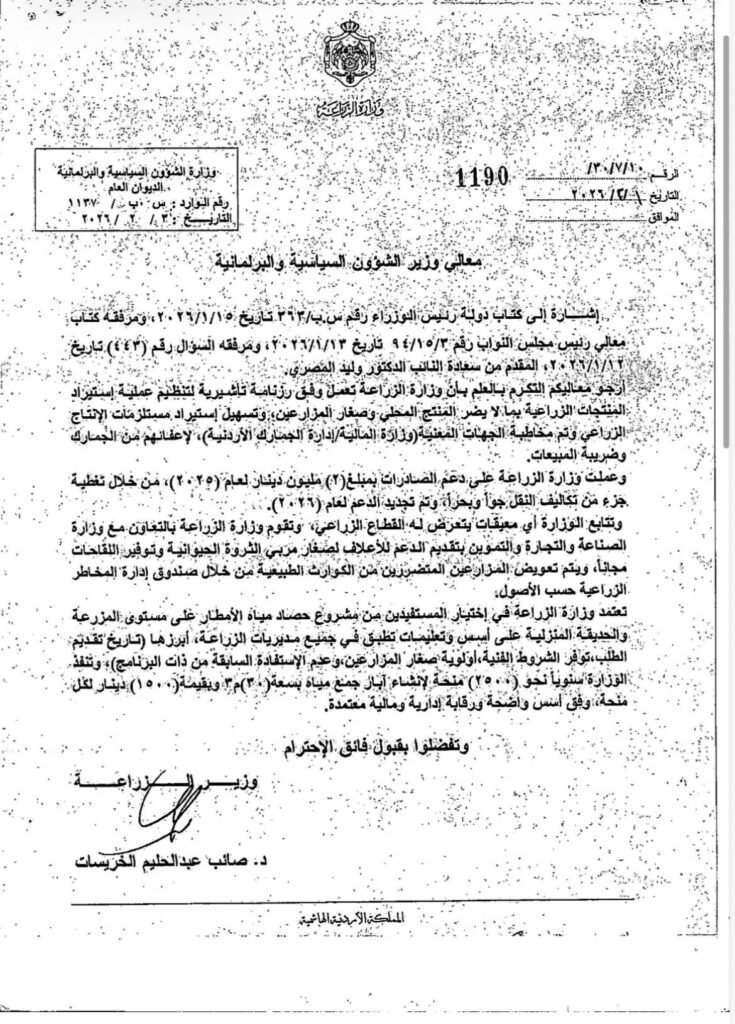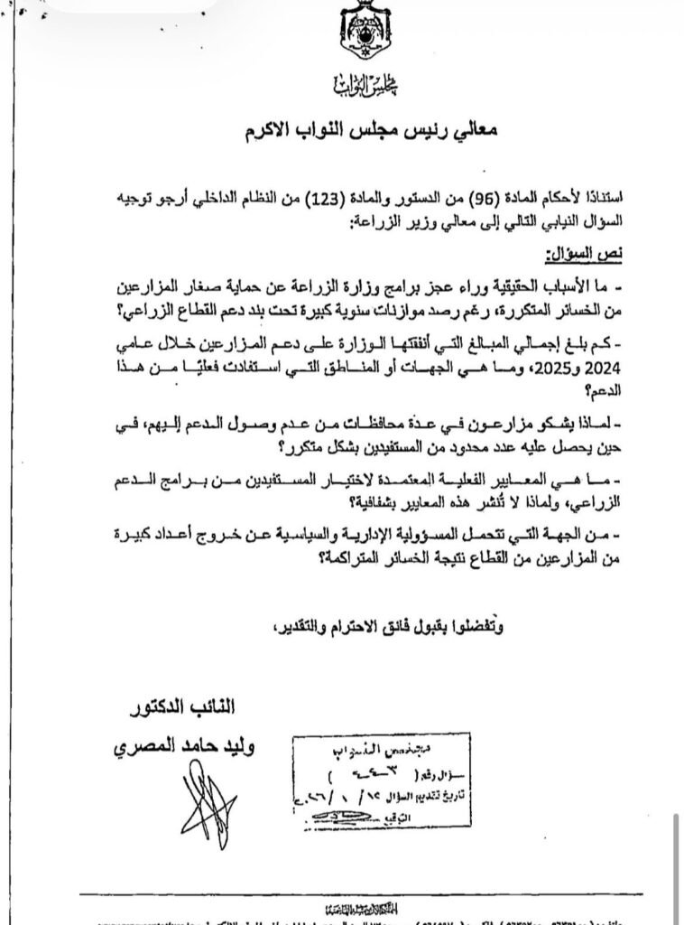 وجه النائب الدكتور وليد المصري مذكرة نيابي الى حكومة حول الزراعة الوطنية والأمن الغذائي الذي يعتبر اولوية استراتيجية لا غنى عنها لحماية الاستقرار المعيشي وتعزيز الاعتماد على الإنتاج المحلي. في إطار الحرص على دعم المنتج الوطني وتخفيف الأعباء عن المواطنين وتعزيز سياسات الأمن الغذائي باعتبارها ركيزة أساسية من ركائز قوة الدولة واستقرارها.
