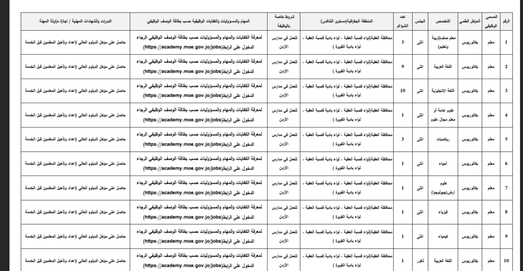يتيح الإعلان للمتقدمين الاطلاع على الشواغر التعليمية المتاحة بحسب التخصصات المطلوبة، والتي يتم تحديثها إلكترونيًا عبر المنصة المعتمدة. ويُنصح جميع الراغبين بالتقديم بمراجعة قائمة الشواغر بعناية للتأكد من توافق مؤهلاتهم العلمية وخبراتهم مع متطلبات الوظائف المعلنة.