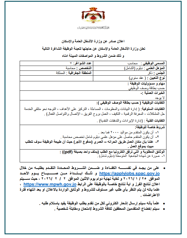 أعلنت وزارة الأشغال العامة والإسكان في المملكة الأردنية الهاشمية عن حاجتها لتعيين موظف جديد ضمن كوادرها، وذلك وفق مجموعة من الشروط والمتطلبات التي حددتها الوزارة، وبما يتوافق مع الأنظمة والتعليمات المعمول بها.