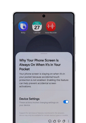 فمثلاً، إذا طرح المستخدمون السؤال: “لماذا تبقى شاشة هاتفي مضاءة دائماً عندما يكون في جيبي؟”، فسيفهم Bixby سياق السؤال ويعرض الإعدادات الملائمة، مثل ميزة “الحماية من اللمس العرَضي”، ما يتيح تفعيلها مباشرة.