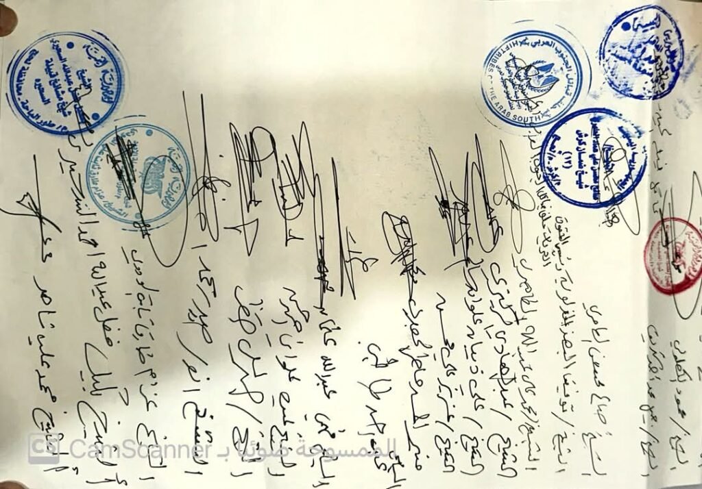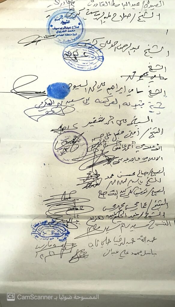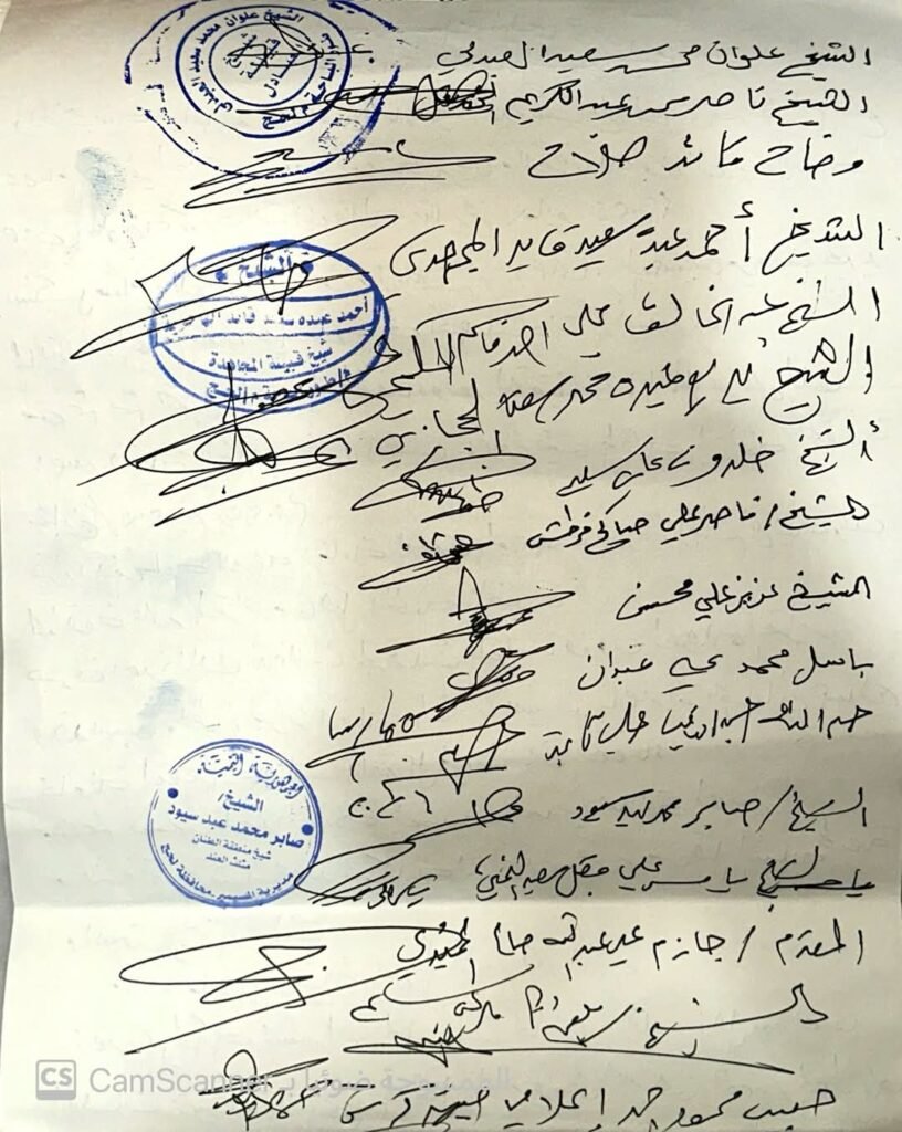 وانطلاقاً من مسؤوليتنا الاجتماعية والقبلية والقانونية، فإننا نحن المشائخ الحاضرون نعلن ضمانتنا العرفية والقبلية والقانونية بما هو له او عليه،