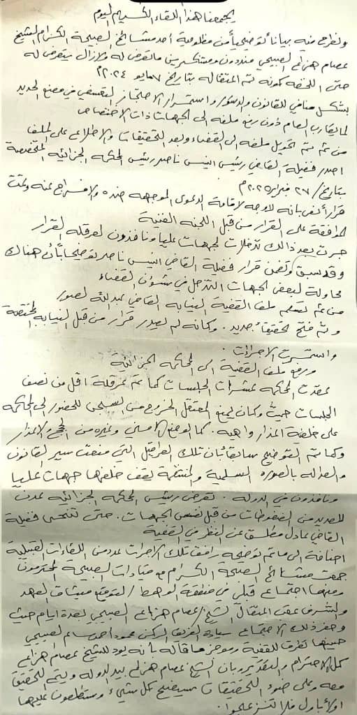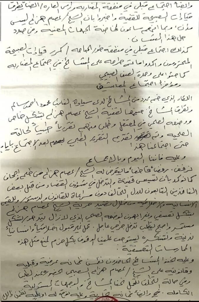 فقد تم اعتقال الشيخ عصام هزاع بتاريخ 7 مايو 2024 في إجراء نرى أنه جاء مخالفاً للقانون والدستور، واستمر احتجازه بصورة تعسفية في مصنع الحديد لمدة تقارب عاماً كاملاً، دون إحالة ملفه إلى الجهات القضائية المختصة وفقاً للإجراءات القانونية المتبعة.