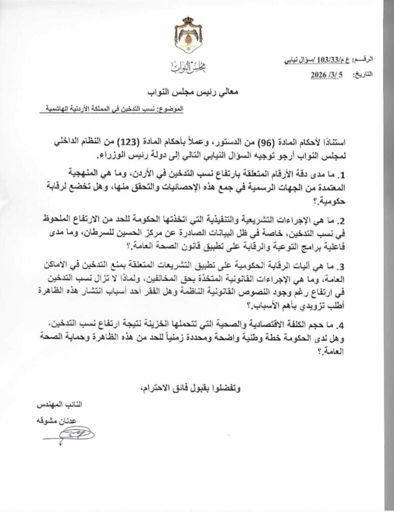 - ما حجم الكلفة الاقتصادية والصحية التي تتحملها الخزينة نتيجة ارتفاع نسب التدخين، وهل لدى الحكومة خطة وطنية واضحة ومحددة زمنياً للحد من هذه الظاهرة وحماية الصحة العامة.؟