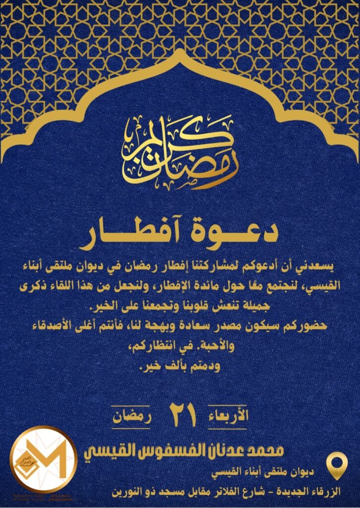 وتأتي هذه المأدبة ضمن اللقاءات الرمضانية التي يحرص السيد محمد عدنان الفسفوس القيسي على تنظيمها سنويًا، لما لها من دور في توطيد العلاقات وتعزيز الحوار بين مختلف الأطراف.
