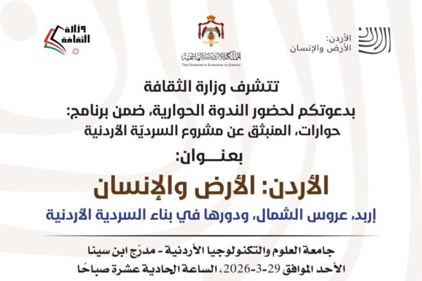 تعقد وزارة الثقافة ، عند الحادية عشرة صباح يوم الأحد المقبل ، ندوة حوارية بعنوان: “الأردن .. الأرض والإنسان.. إربد عروس الشمال ودورها في بناء السردية الأردنية” في جامعة العلوم والتكنولوجيا ضمن برنامج حوارات المنبثق عن مشروع السردية الأردنية.