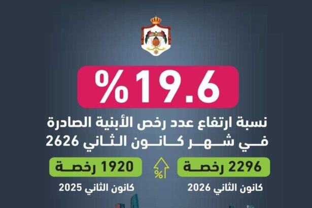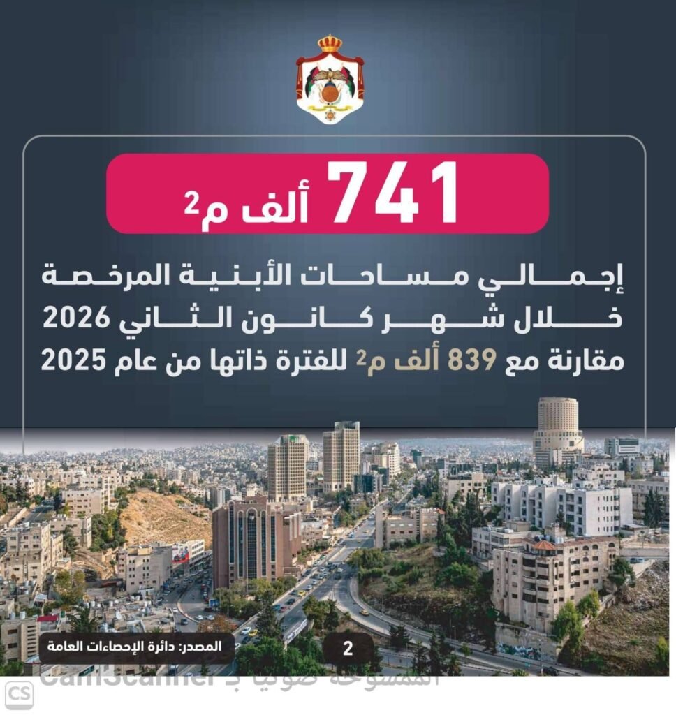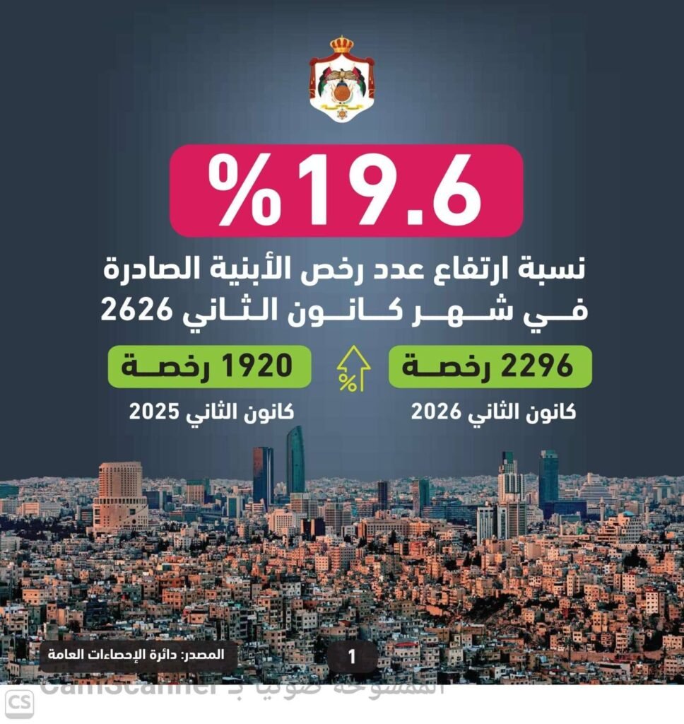 أصدرت دائرة الإحصاءات العامة تقريرها الشهري حول النشاط العمراني ورخص الأبنية في المملكة عن كانون الثاني الماضي، حيث بلغ إجمالي عدد رخص الأبنية الصادرة في المملكة 2296 رخصة، مقارنة مع 1920 رخصة خلال الفترة نفسها من 2025، بارتفاع نسبته 19.6%.