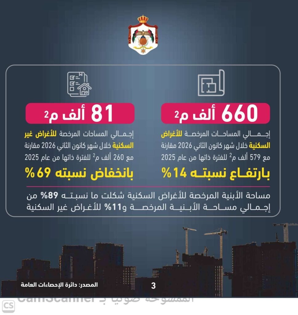 وعلى صعيد أغراض الترخيص، بلغت المساحات المرخصة للأغراض السكنية نحو 660 ألف متر مربع، مقارنة مع نحو 579 ألف متر مربع خلال الفترة نفسها من 2025 بارتفاع نسبته 14%، في حين بلغت مساحة الأبنية المرخصة للأغراض غير السكنية نحو 81 ألف متر مربع، مقارنة مع نحو 260 ألف متر مربع خلال الفترة نفسها من 2025، بانخفاض نسبته 69%.