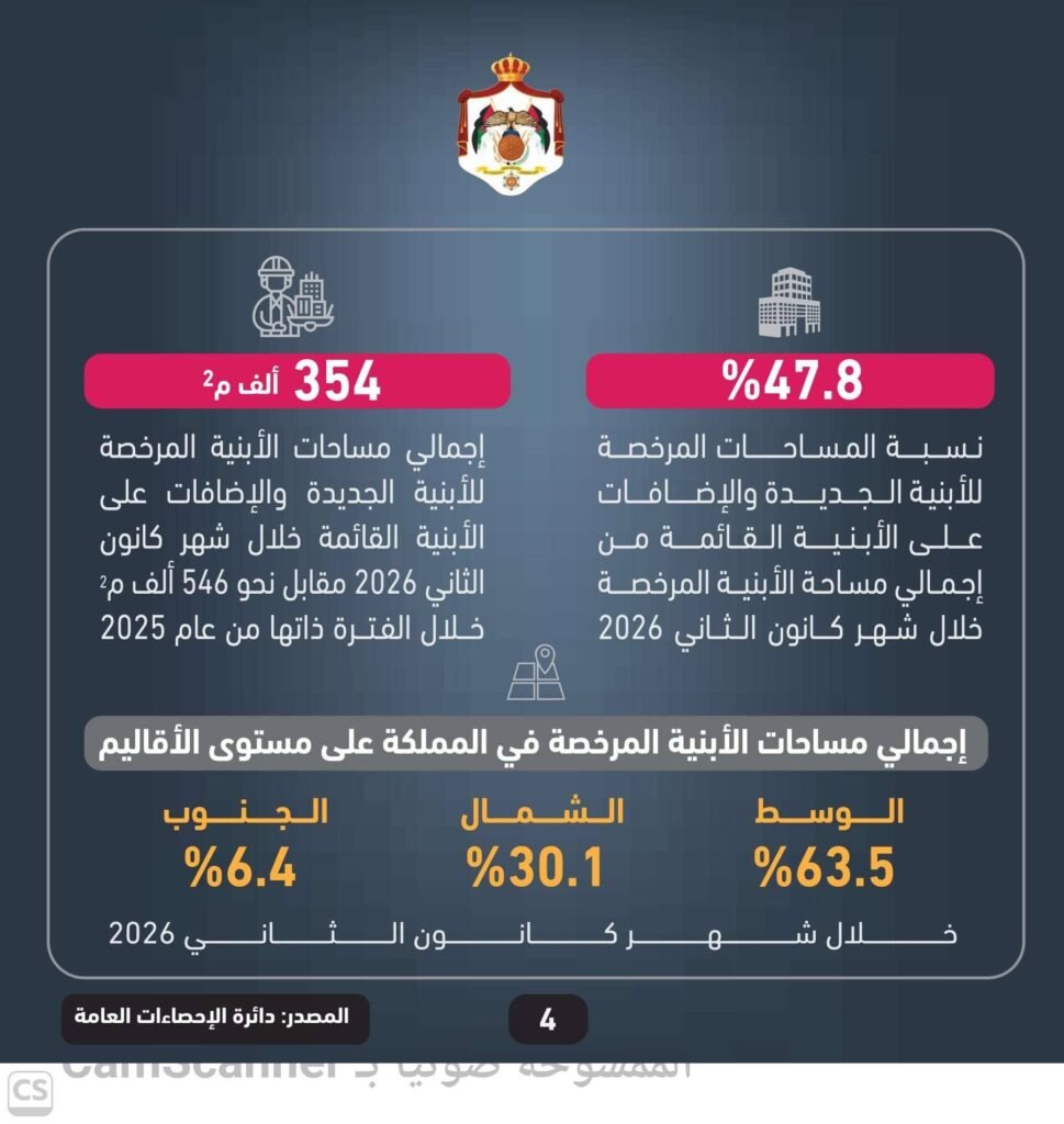 وشكلت المساحة المرخصة للأبنية الجديدة والإضافات على الأبنية القائمة ما نسبته 47.8% من إجمالي مساحة الأبنية المرخصة خلال كانون الثاني الماضي، في حين شكلت المساحة المرخصة للأبنية القائمة ما نسبته 52.2%، وبلغ إجمالي مساحة الأبنية المرخصة للأبنية الجديدة والإضافات على الأبنية القائمة نحو 354 ألف متر مربع، مقابل نحو 546 ألف متر مربع خلال الفترة نفسها من 2025، بانخفاض نسبته35.2%.