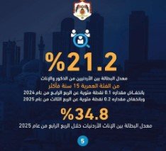 * بلغ معدل البطالة بين الذكور 13.8% خلال الربع الرابع من عام 2025، بانخفاض مقداره 1.4 نقطة مئوية مقارنة بنفس