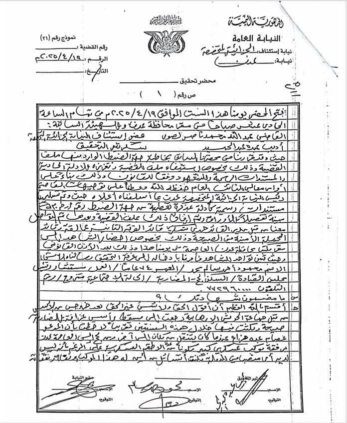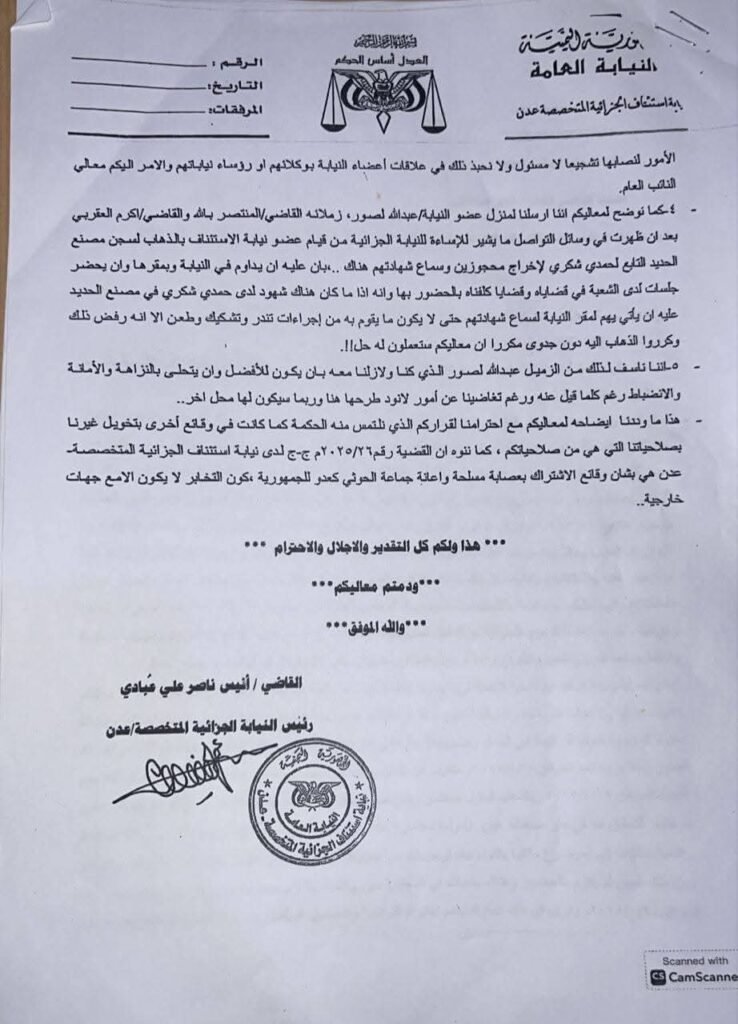 لقد أظهرت مذكرة صادرة عن رئيس النيابة الجزائية القاضي أنيس الفضلي حجم التجاوزات التي رافقت هذه القضية، وكشفت عن ممارسات غير قانونية، من بينها ما قام به عضو النيابة عبدالله لصور، إضافة إلى ملابسات أخذ شهادة من الفريق محمود الصبيحي قبل توليه منصبه في مجلس القيادة الرئاسي.