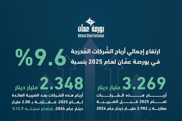 أظهرت بيانات شركة بورصة عمّان، أن 96 بالمئة من الشركات المدرجة في البورصة، والبالغ عددها 159 شركة، والتي قدّمت بياناتها المالية السنوية المدققة عن عام 2025، ارتفعت إجمالي أرباحها قبل الضريبة بنسبة 9.6 بالمئة عن عام 2024.