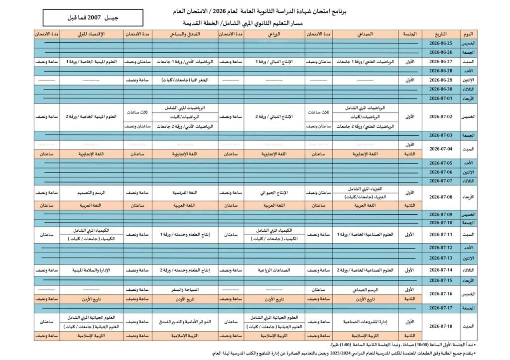 أعلنت وزارة التربية والتعليم، الأحد، عن جدول امتحانات شهادة الدراسة الثانوية العامة لعام 2026 لطلبة الصف الثاني عشر.