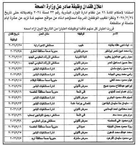 اعلنت وزارة التربية والتعليم عن فقدان وظائف لموظفين يعملون لديها وذلك حسب الكشف ادناه:-