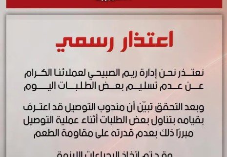قدم مطعم “شاورما الريم” اعتذارا رسميا لزبائنه بلهجة تملؤها الطرافة والذكاء التسويقي، اثر تعذر تسليم بعض الطلبيات لاصحابها، كاشفا عن سبب غير مألوف اثار تفاعلا واسعا.