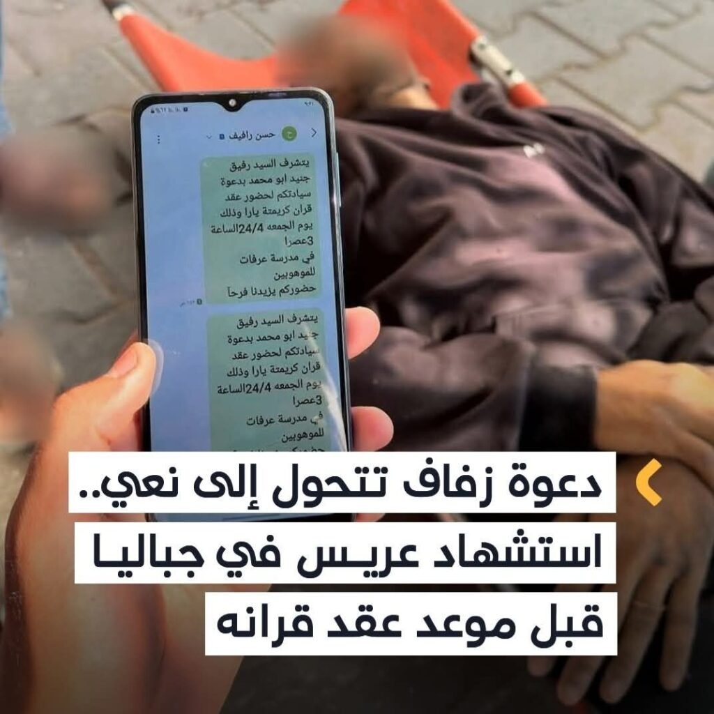 عريس من غزة تحولت دعوة زفافه إلى إعلان نعي بعدما تلقى الأهالي رسائل على هواتفهم بالاعتذار عن عدم حضور عقد قران الشاب الخلوق عبد الجليل جنيد الذي كان مقررا يوم الجمعة
