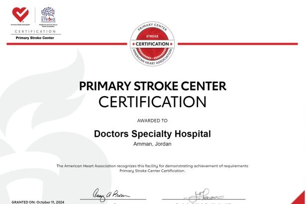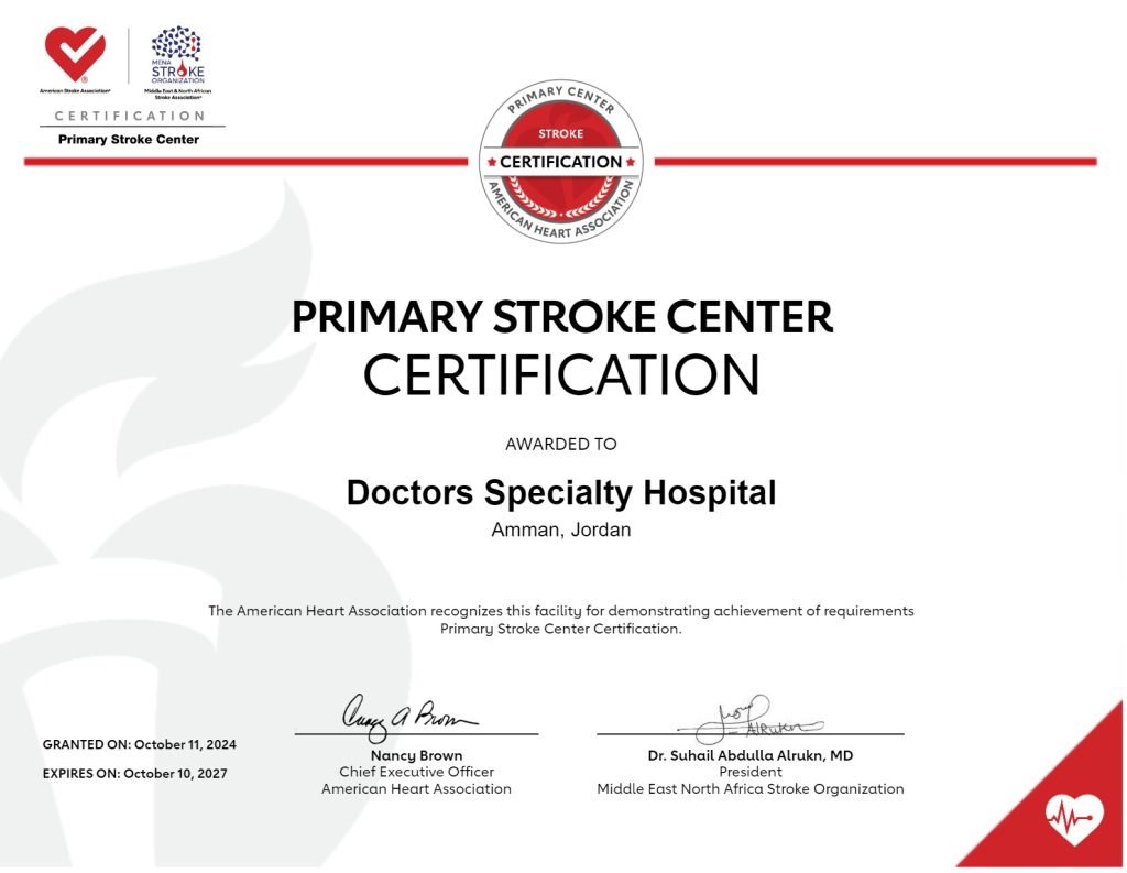 حصل المستشفى التخصصي على شهادة اعتماد كمركز لعلاج السكتات الدماغية من قبل جمعية القلب الأمريكية AHA وجمعية السكتة الدماغية الأمريكية ASA، ليصبح بذلك أول مستشفى في الأردن ومن أوائل المستشفيات على مستوى الشرق الأوسط الذي ينال هذا الاعتماد الدولي المرموق.