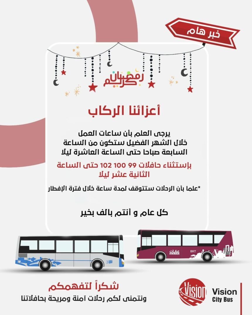 وكالة تليسكوب الإخبارية أعلنت شركة "رؤية عمان" (Vision City Bus) عن المواعيد الجديدة لعمل الحافلات خلال شهر رمضان المبارك، لتكون على النحو التالي: