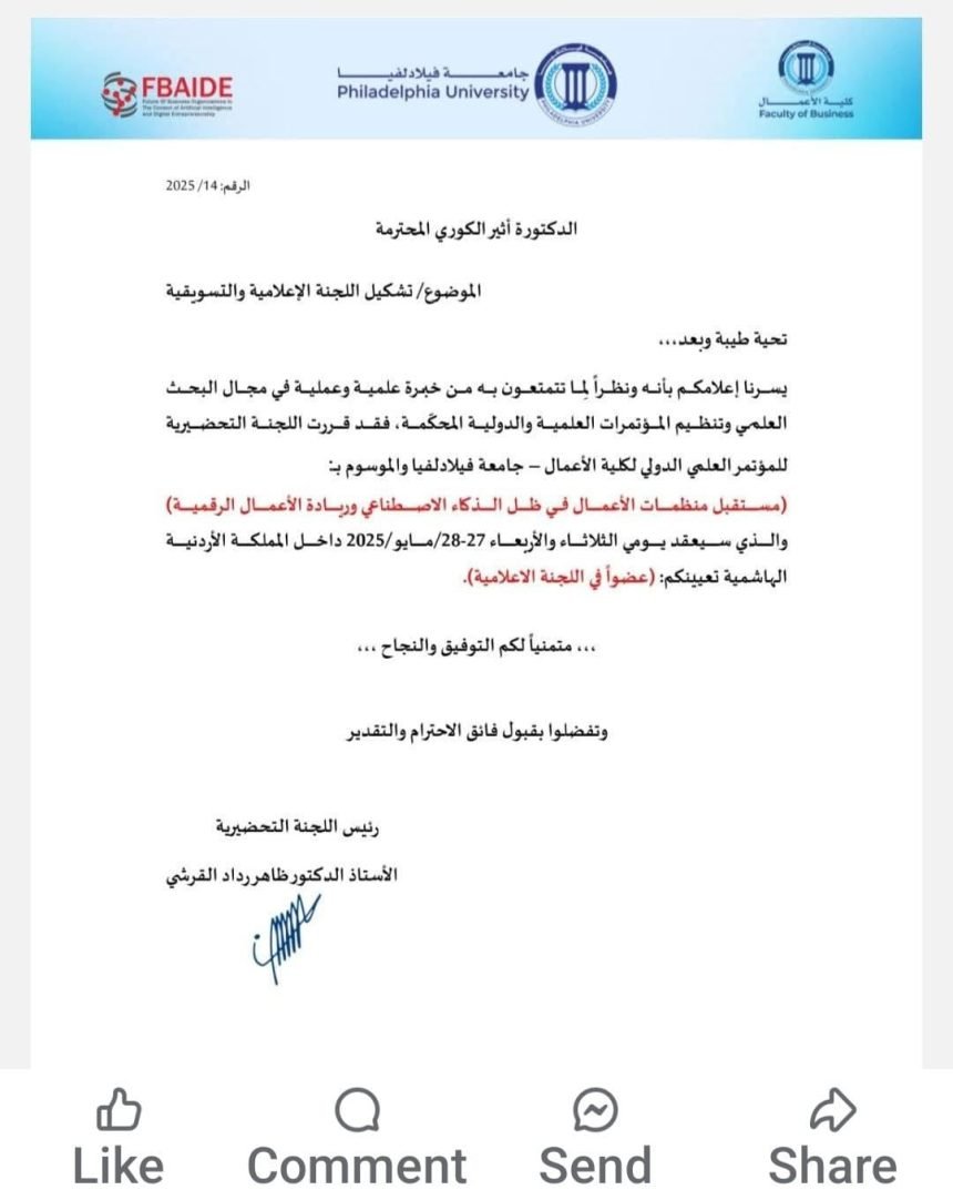 مؤتمر(سكوبس Scopus)يسر كلية الأعمال في جامعة فيلادلفيا - الأردن…دعوة السادة الباحثين من داخل الأردن وخارجه من كافة دول العالم للمشاركة في المؤتمر العلمي الدولي بعنوان: الذي سيعقد وجاهيًا في المملكة…