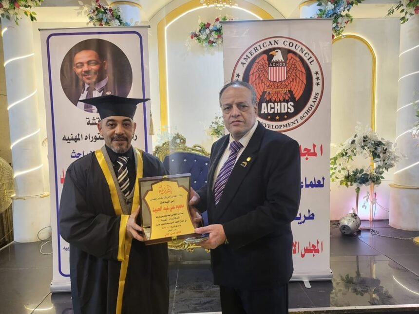 منح الدكتور محمود علي عبد الحميد درجة الدكتوراه المهنية في العلوم السياسية من المجلس الأمريكي لعلماء التنمية البشرية