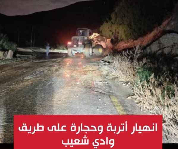 انهيار أتربة وحجارة على طريق وادي شعيب